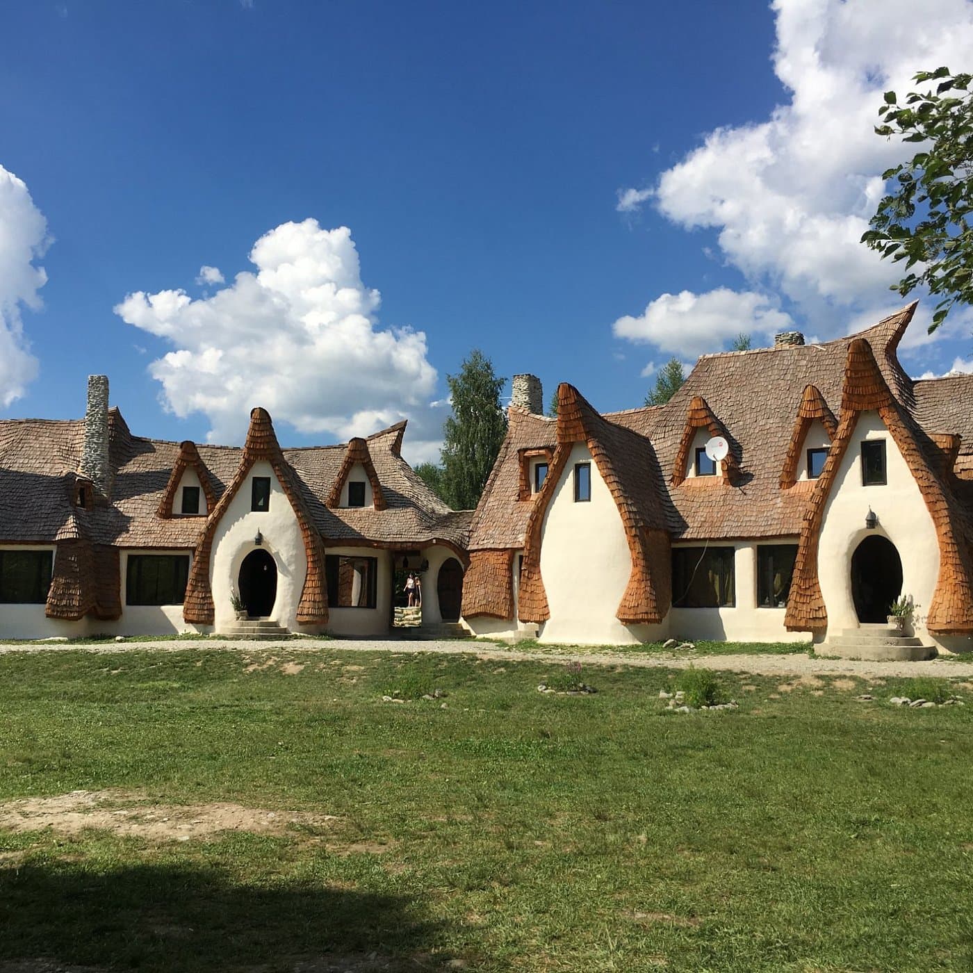 O construcție magică din lut și paie, ridicată la poalele Munților Făgăraș. Arhitectura organică și formele ondulate te fac să simți că ai pășit într-o poveste a fraților Grimm.